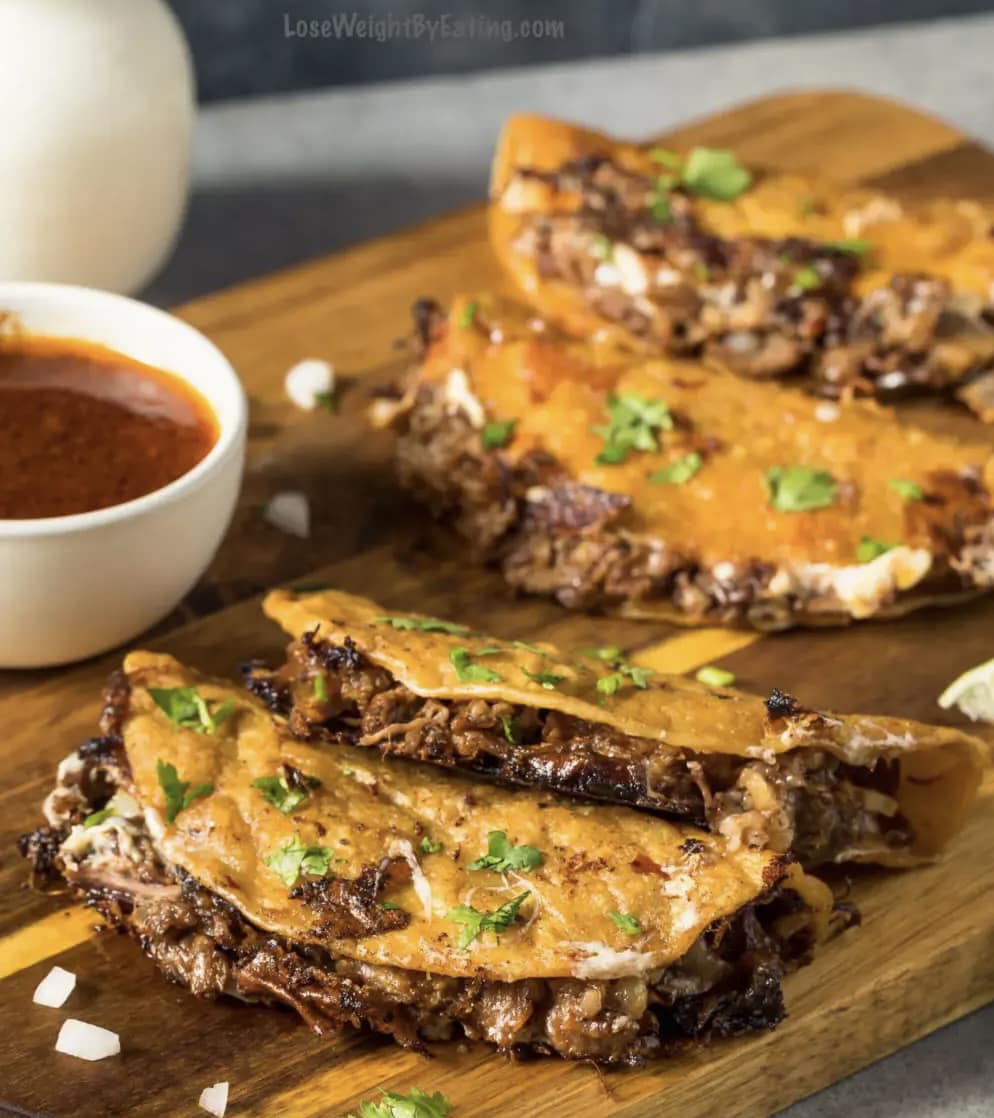 Plus, these healthy birria tacos are just 130 calories each! Making them a healthy protein packed (low carb) dinner that’s perfect for taco Tuesday, or any night of the week.